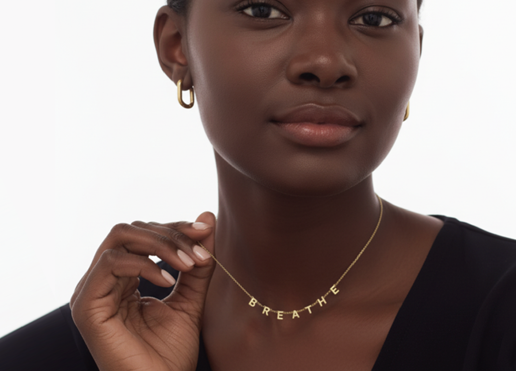 breathe is an always-on reminder, a wearable cue to inhale, exhale, reset. Timeless letterforms on a fine chain that layers with everything, including your Shift.